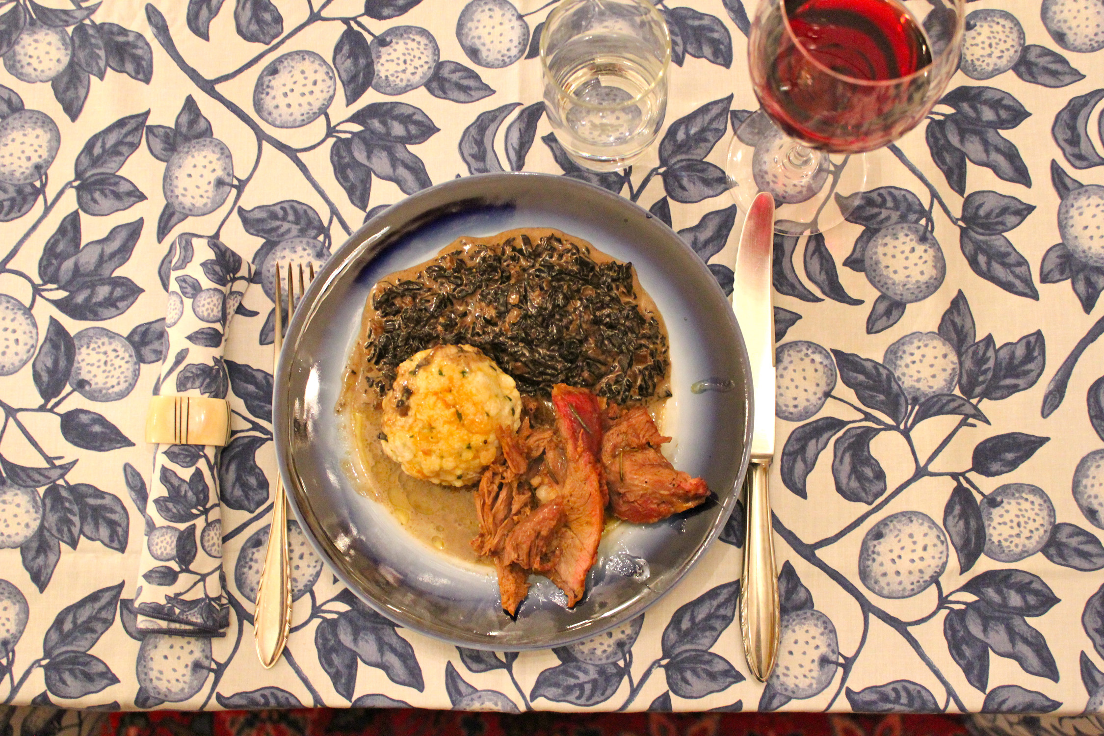Lammschlögel, Semmelknödel, Herbsttrompetensauce