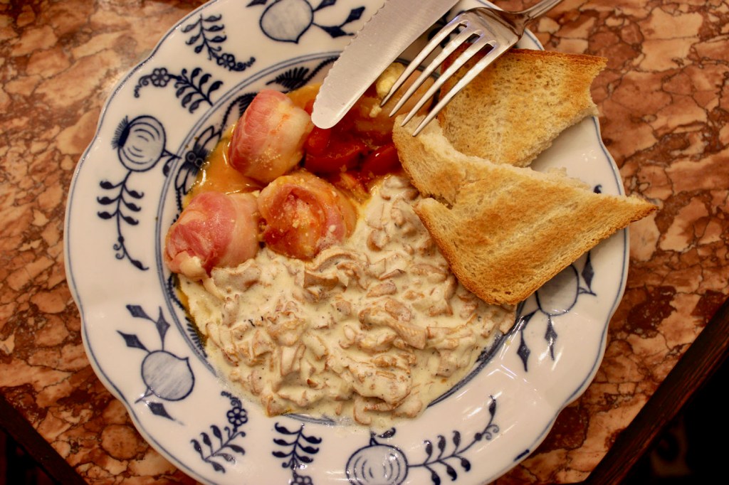 Eierschwammerlsauce (Echter Pfifferling), Ziegenkäse im Speckmantel