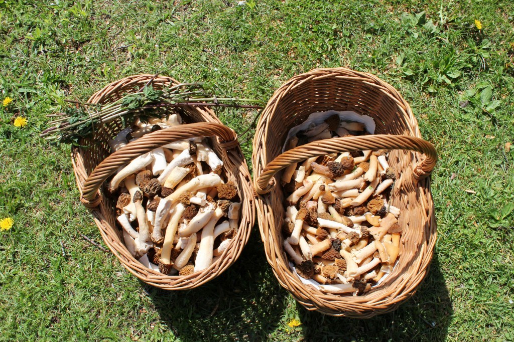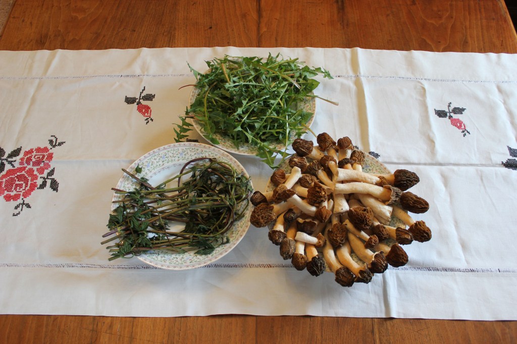 Morcheln (Böhmische Verpel) und wilder Spargel aus der Au, Löhwenzahnsalat aus der Plantage (Weingartenpfirsich udn Bitterztronen9