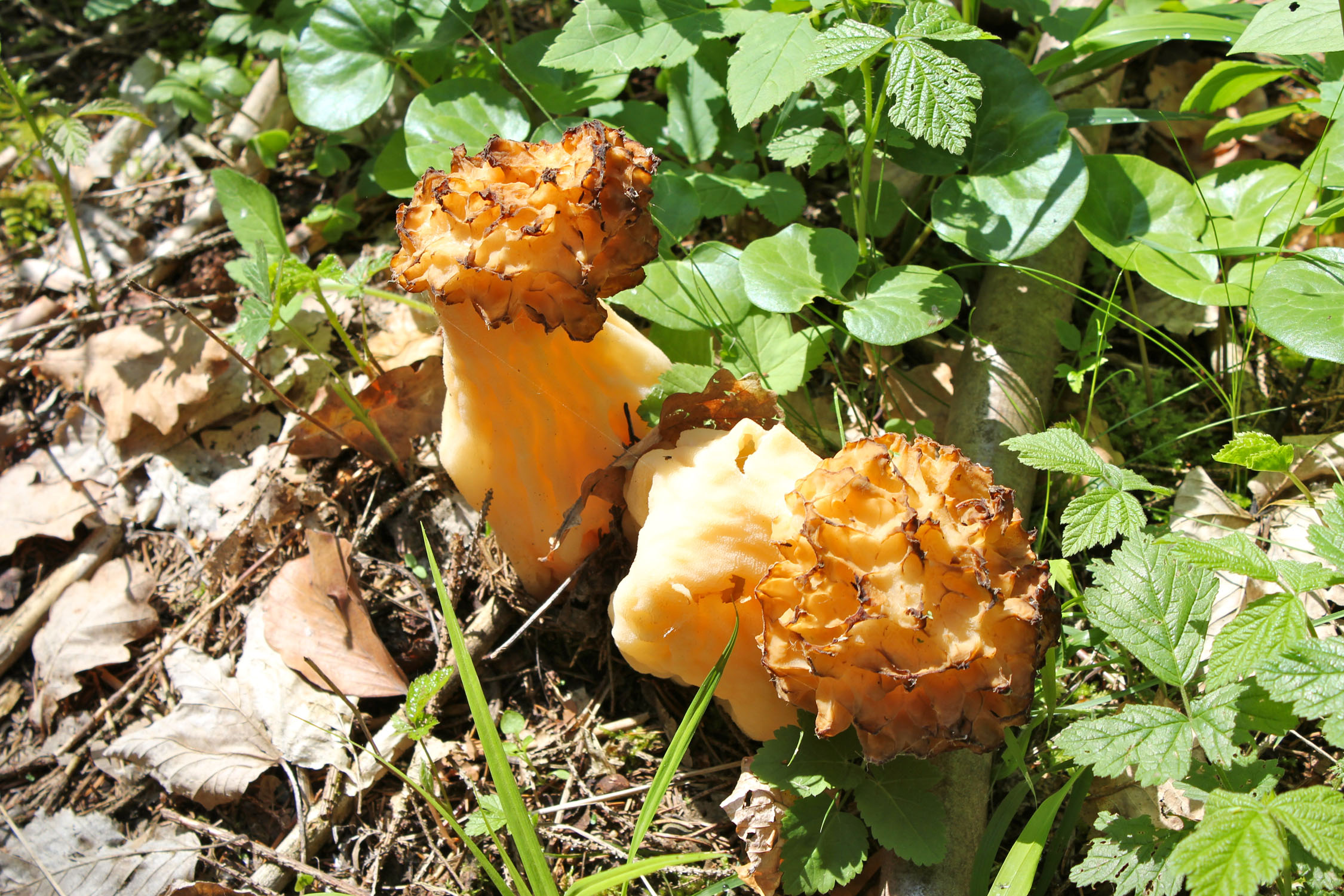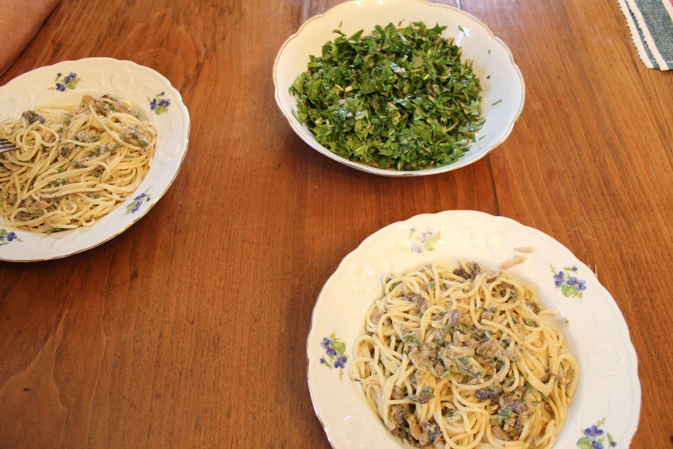 Morcheln (Böhmische Verpel) und wilder Spargel aus der Au, Löhwenzahnsalat aus der Plantage (Weingartenpfirsich udn Bitterztronen9