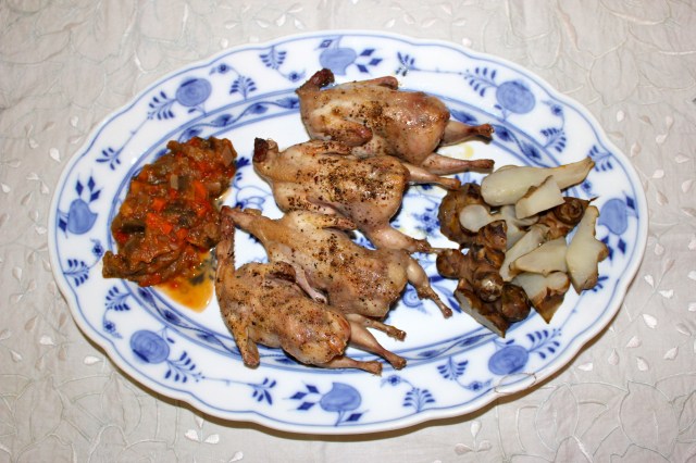 Wachteln mit Topinambur und Gemüse (Auberginen, Karotten, Tomaten)