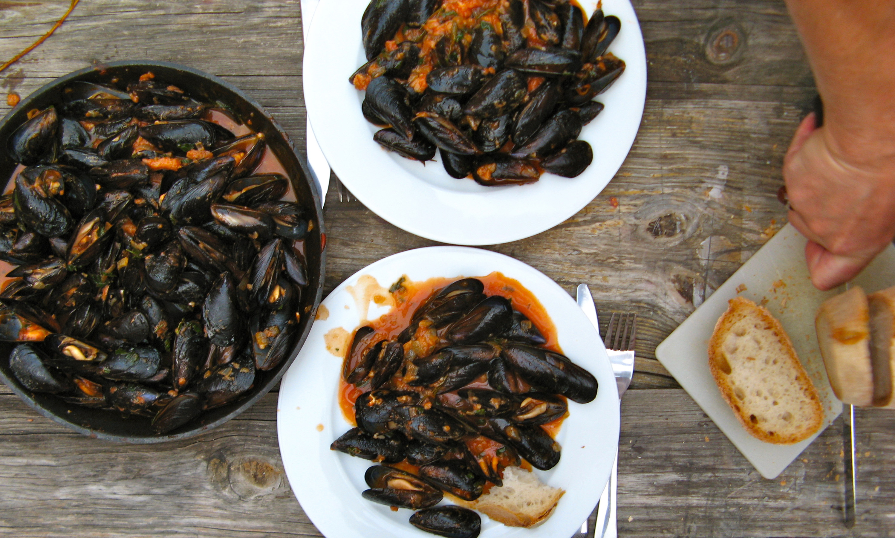 Miesmuscheln, Tomatensauce, Rosmarin, Basilikum, Zwiebel, Knoblauch, Weißbrot